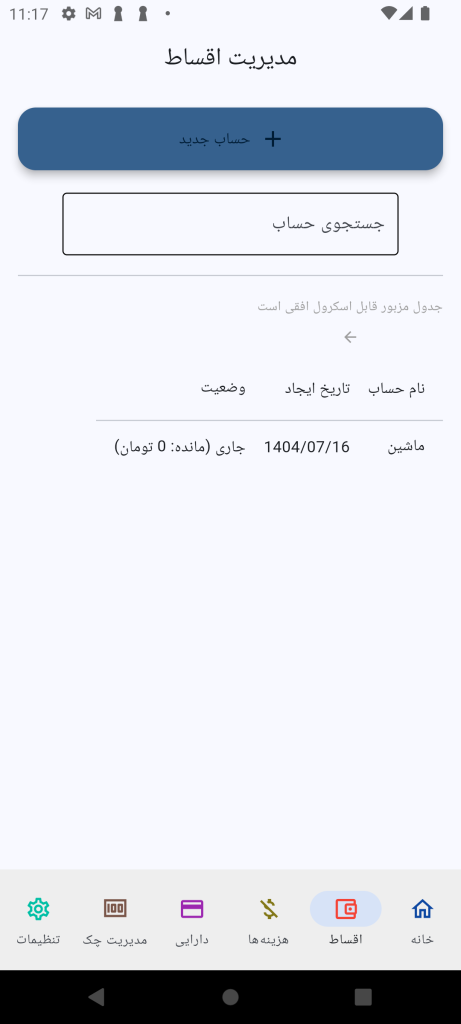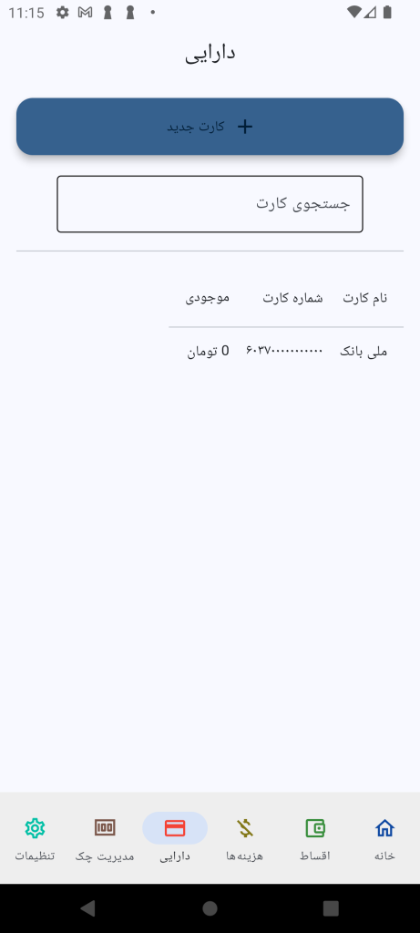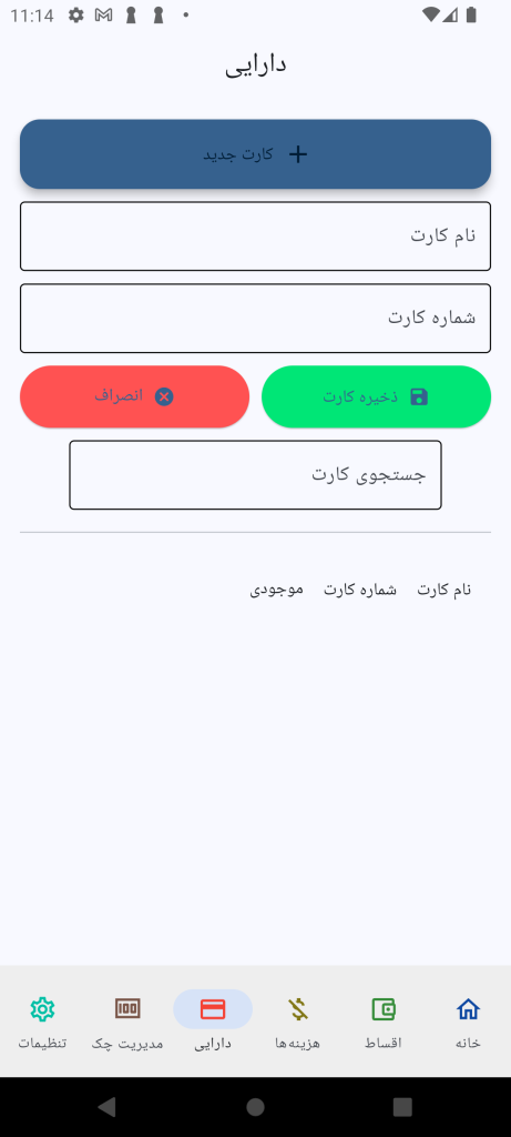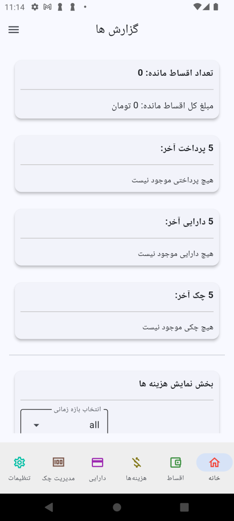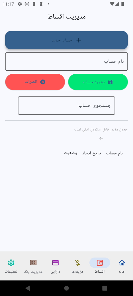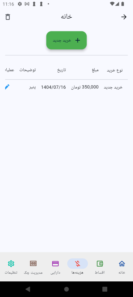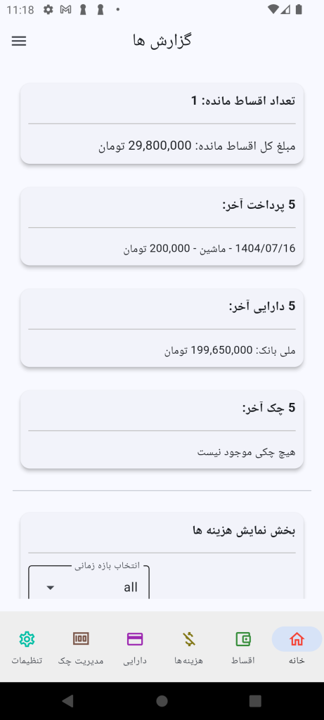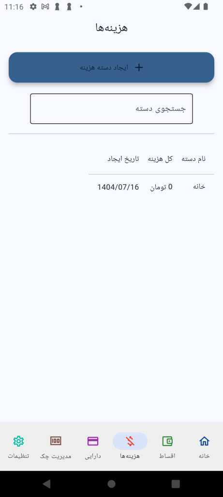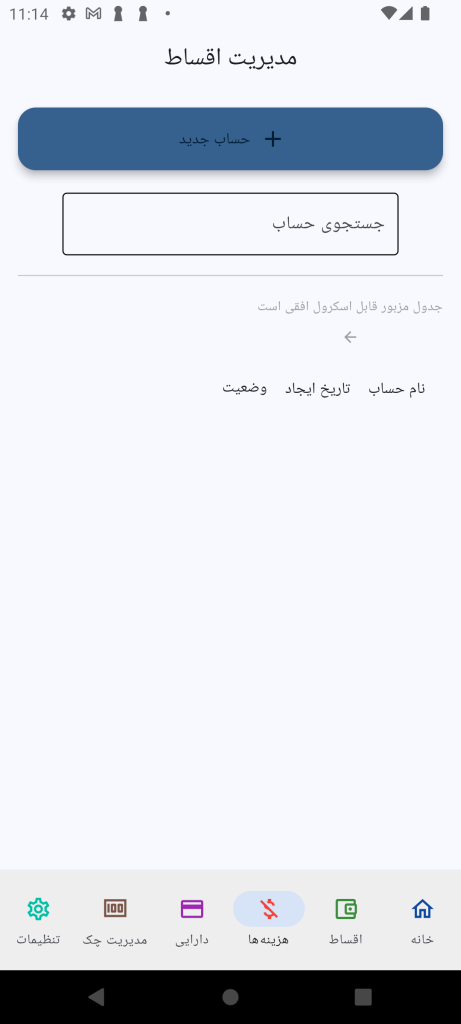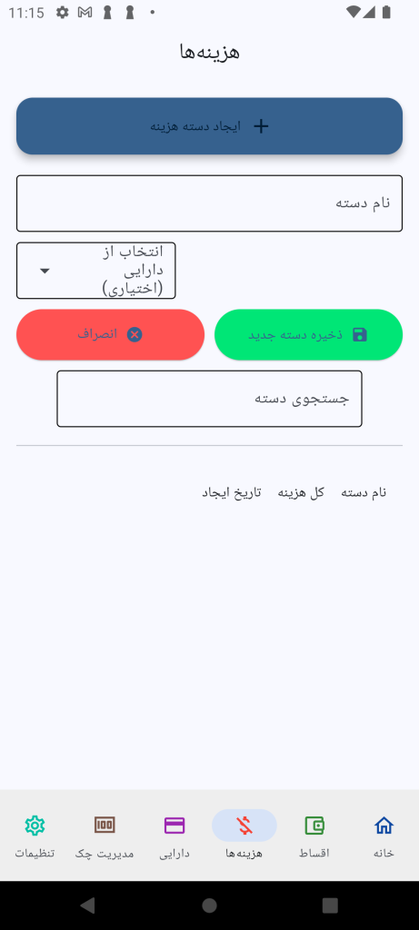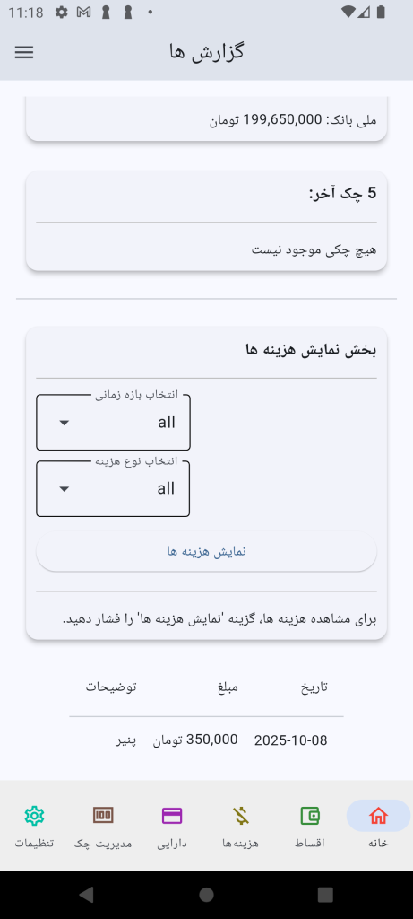 3- صفحه مدیریت هزینه، که متصل به بخش حساب ها بوده و تمامی هزینه ها با قید تاریخ و نوع هزینه، در بخش حساب نیز اعمال می شود تا همیشه باقی مانده درست در دسترس باشد