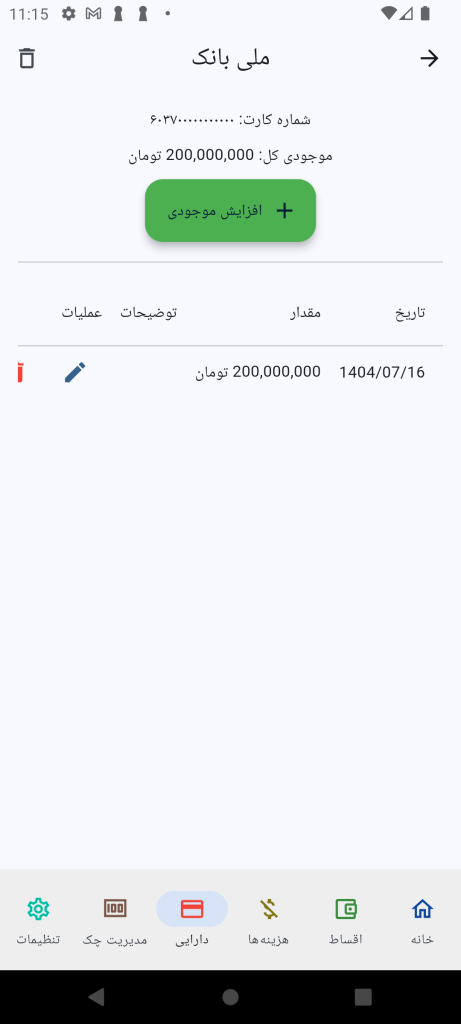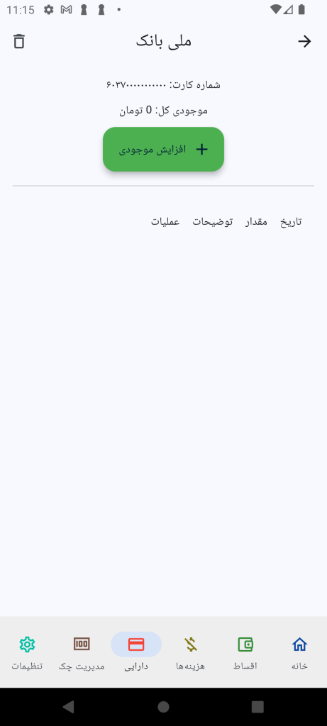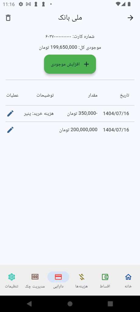 2- صفحه حساب بانکی و میزان پول موجود در حساب (دارایی)
