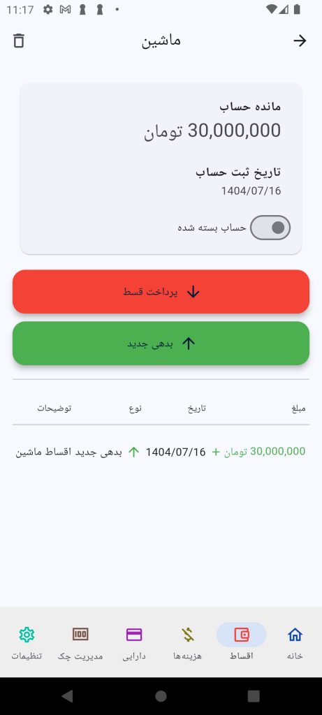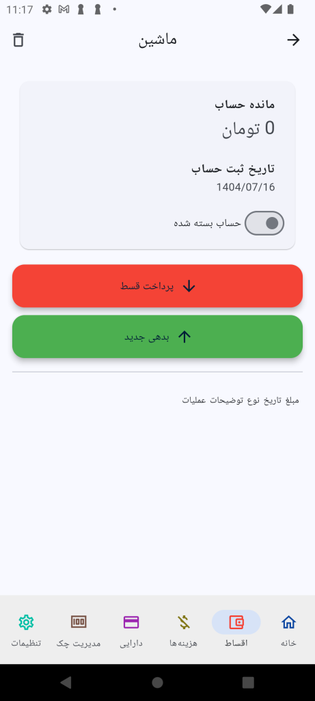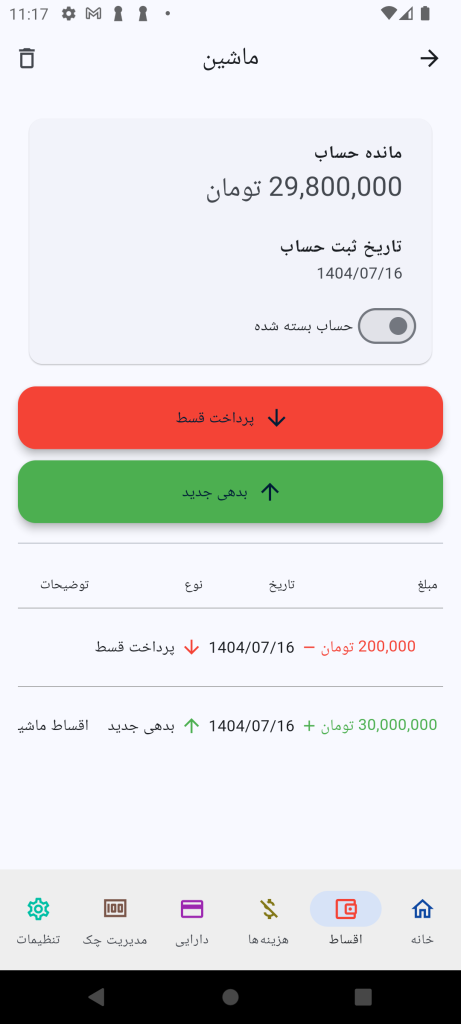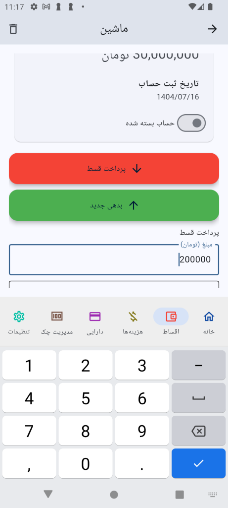 این نرم افزار که توسط کتابخانه flet و زبان برنامه نویسی python برای سیستم عامل android توسعه داده شده است، دارای قابلیت های بسیار بوده که کار را برای افراد به شدت ساده تر کرده و تمامی حساب و کتاب های فرد را در یک مجموعه کامل جمع آوری میکند