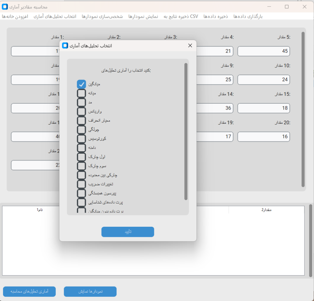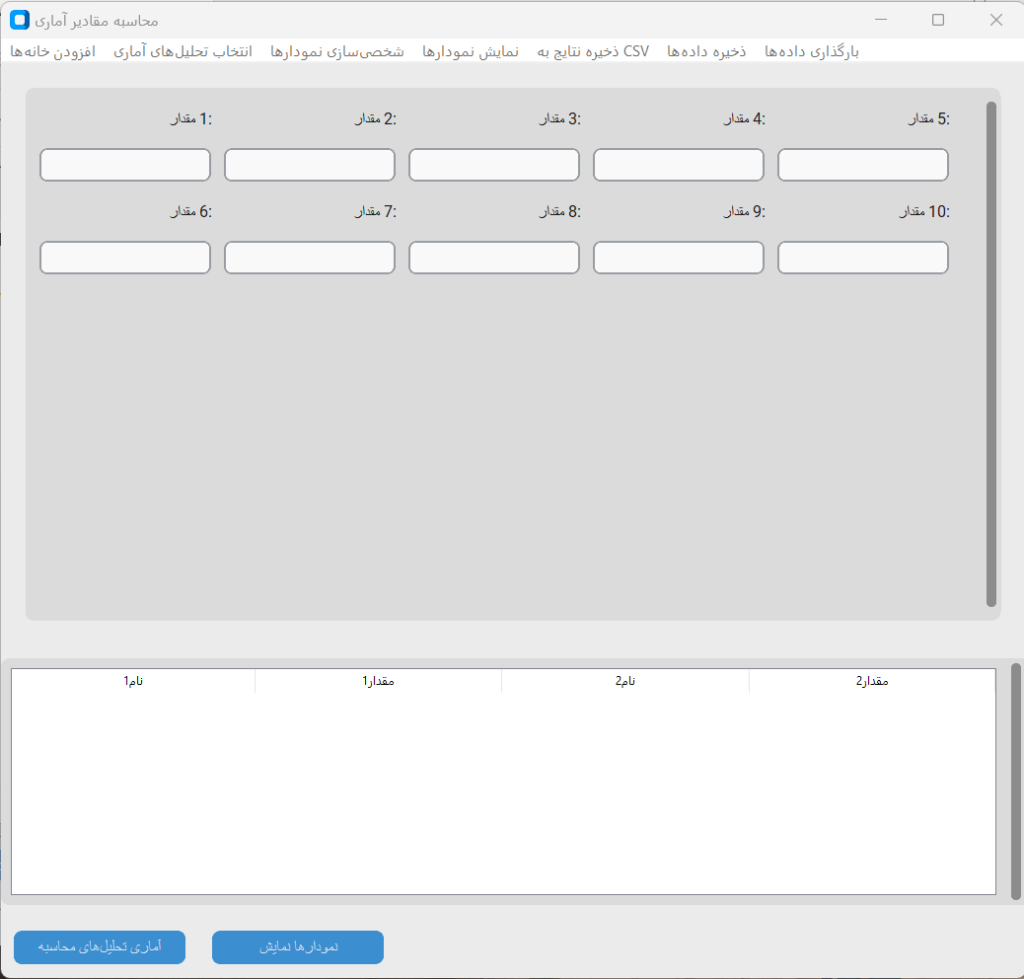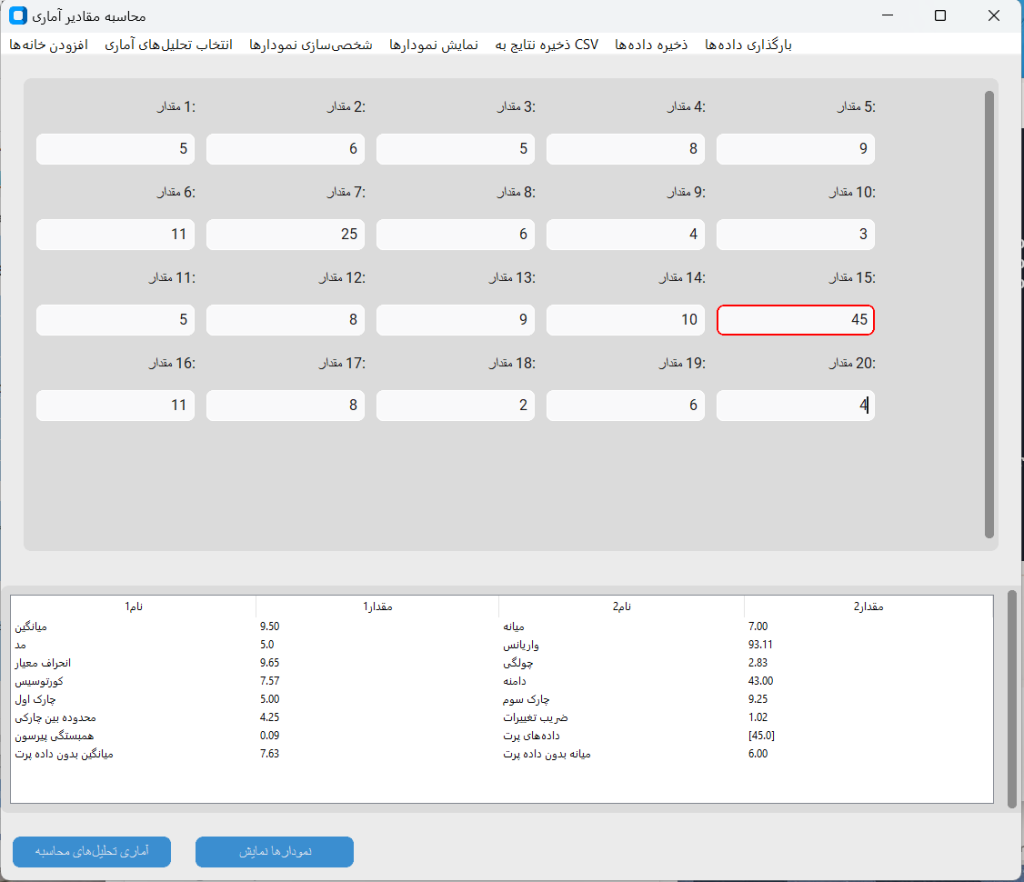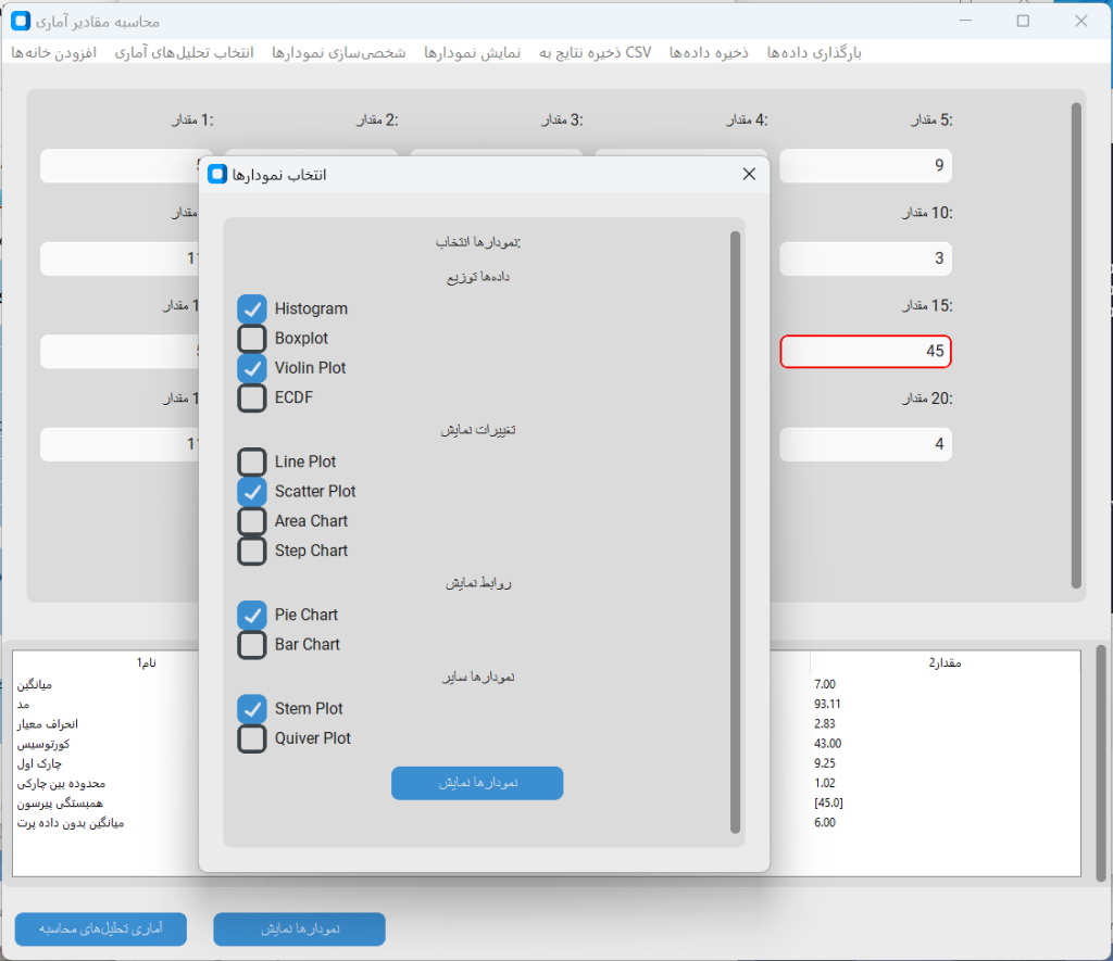 کاربر میتواند دادههای عددی خود را وارد کرده و مجموعهای از تحلیلهای آماری شامل میانگین، میانه، واریانس، انحراف معیار، چولگی، کورتوسیس و شاخصهای دیگر را محاسبه کند. علاوه بر آن، امکان شناسایی دادههای پرت، ترسیم نمودارهای متنوع (هیستوگرام، باکسپلات، نمودار خطی، پراکندگی، پایچارت و …) و ذخیره نتایج در قالبهای CSV، JSON و Word فراهم شده است.